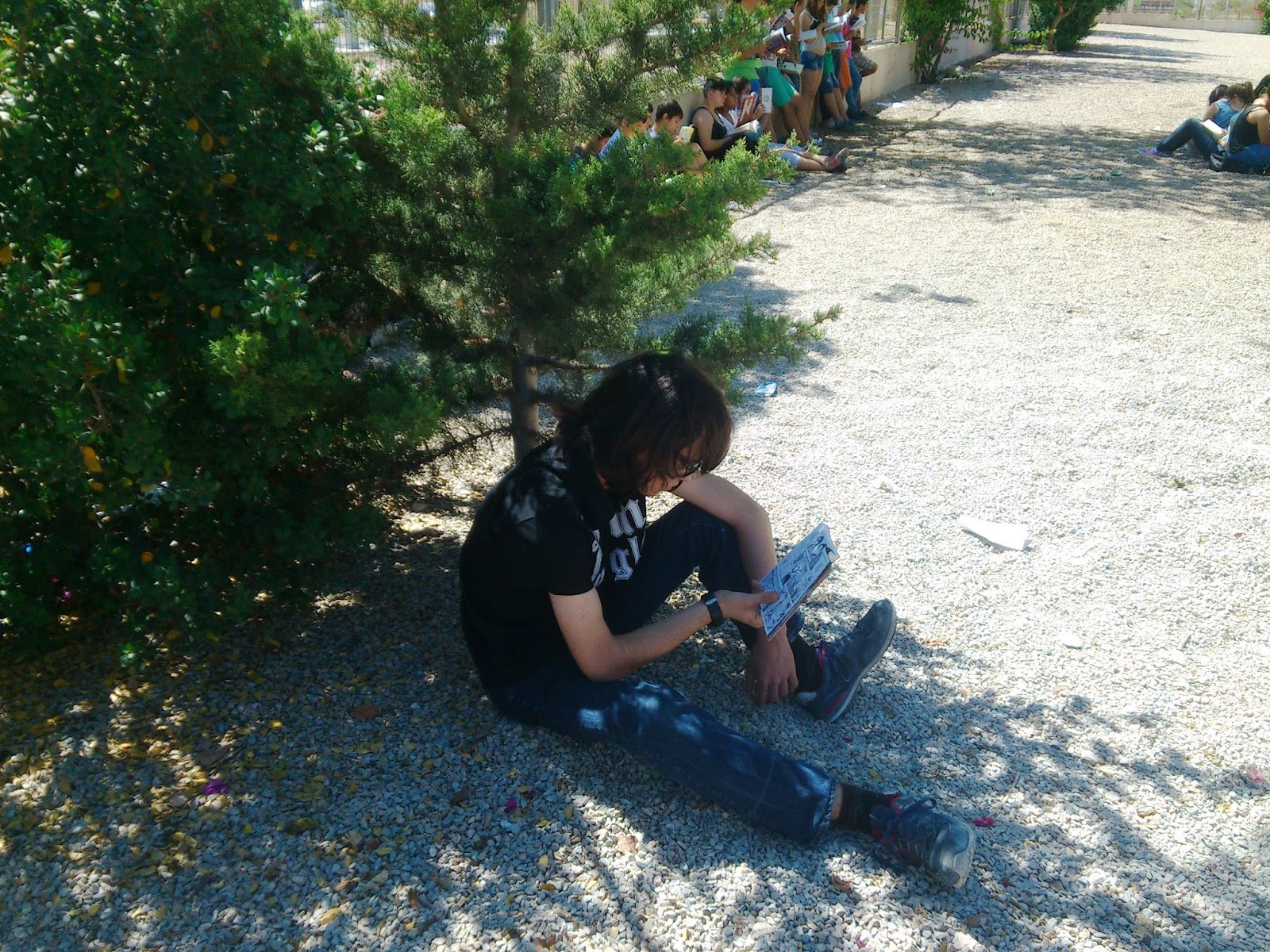 Esta mañana, durante 15 minutos, un nutrido grupo de alumnos y profesores, hemos disfrutado en el patio del Instituto leyendo, aprovechando la iniciativa del Premio Mandarache. En círculo, a la sombra, en grupo , o en soledad, simplemente nos hemos dejado llevar por donde las palabras de cada libro nos ha transportado.